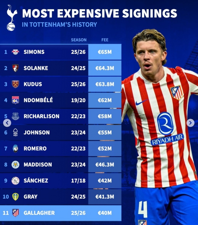 1月15日讯 热刺已经官宣签下马竞中场加拉格尔,《转会市场》也统计了热刺队史引援榜情况,哈维·西蒙斯等4将超过6000万欧元。